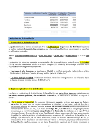 Este documento resume la población española, incluyendo sus fuentes demográficas, distribución, factores que la afectan y movimiento natural. Describe la evolución de España a través de diferentes regímenes demográficos, caracterizados por cambios en las tasas de natalidad y mortalidad. Actualmente, España tiene una baja tasa de natalidad que no alcanza los niveles de reemplazo, y una mortalidad estable aunque creciente debido al envejecimiento de la población.