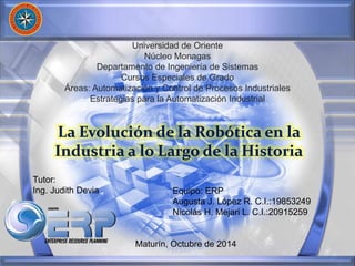 Este documento presenta la evolución de la robótica industrial a lo largo de la historia. Comienza definiendo un robot industrial como un manipulador multifuncional reprogramable capaz de mover materiales y herramientas según trayectorias programadas. Luego describe algunos tipos de robots industriales y hitos en el desarrollo de la robótica desde 1890 hasta 2011. Finalmente concluye que los robots industriales juegan un papel importante en la automatización y que el mercado de robots ha tenido un crecimiento constante.