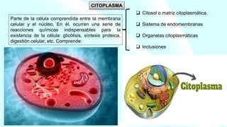 El citoplasma está compuesto por el citosol y varias organelas encerradas en membranas. El citosol contiene el citoesqueleto formado por microtúbulos, microfilamentos y filamentos intermedios que dan forma y permiten el movimiento celular. El sistema de endomembranas incluye el retículo endoplasmático rugoso y liso, el complejo de Golgi, lisosomas y vacuolas. Las mitocondrias, cloroplastos y otros plastidios tienen doble membrana. Los ribosomas, centrosomas y otros