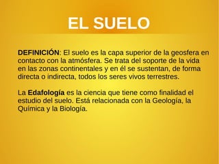 El suelo es la capa superior de la Tierra que soporta la vida. Está compuesto de tres fases: sólida (minerales y materia orgánica), líquida (agua con iones disueltos), y gaseosa (menos O2 y más CO2 que el aire). Los suelos se componen de horizontes que varían en propiedades como la profundidad (horizontes A, B, C y la roca madre D). Múltiples factores como la roca madre, el clima y la biota influyen en la formación y evolución del suelo a