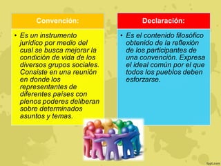 Este documento describe varias convenciones internacionales sobre derechos humanos, incluyendo la Declaración Universal de los Derechos Humanos y convenciones que reconocen los derechos de los niños, las personas discapacitadas, y las mujeres. El objetivo es reconocer estos derechos en el marco legal internacional de los derechos humanos.