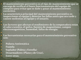 El documento describe los aspectos clave del mantenimiento preventivo de equipos de cómputo, incluyendo inspeccionar periódicamente el equipo para detectar fallas tempranas, limpiar el equipo del polvo y otras partículas que pueden dañarlo, y utilizar herramientas como pulseras antiestáticas, franelas y sopladores para realizar el mantenimiento de manera segura y evitar daños futuros.