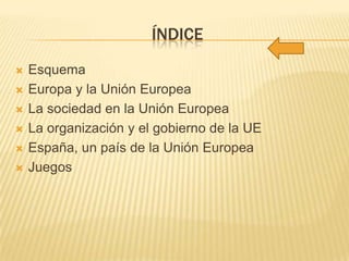 El documento proporciona información sobre la Unión Europea y la sociedad en Europa. La Unión Europea está formada por 27 países democráticos europeos con una población de unos 500 millones de habitantes. La población de la UE vive principalmente en ciudades y disfruta de los beneficios de vivir en democracias desarrolladas. El documento también describe la organización política de la UE y el lugar de España como miembro de la Unión.