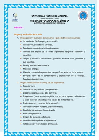Este documento presenta el plan de estudios de tres unidades académicas sobre biología. La Unidad 1 cubre el origen y evolución del universo, la Tierra, y la vida. La Unidad 2 examina las bases químicas de la vida, incluyendo biomoléculas como carbohidratos, lípidos, proteínas y ácidos nucleicos. La Unidad 3 introduce el estudio de la biología celular, con secciones sobre la teoría celular, el microscopio, la estructura y función celular, la multiplicación celular y los tej