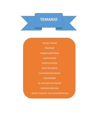 Este documento presenta un temario sobre conceptos filosóficos y éticos como el juicio moral, la libertad, la responsabilidad, la autonomía, la heteronomía, el acto humano, la convivencia moral, la moralidad, la conciencia moral, el existencialismo y la relación entre el juicio moral y las circunstancias.