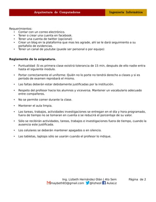 Este documento presenta la asignatura de Arquitectura de Computadoras para la carrera de Ingeniería Informática. La asignatura tiene como objetivo principal que los estudiantes reconozcan e identifiquen la arquitectura de un microprocesador y una microcomputadora para seleccionar la más adecuada para una aplicación. El temario cubre aspectos como la arquitectura del microprocesador, organización de memorias, buses, chipsets y estándares en microcontroladores. La asignatura requiere que los estudiantes cuenten con correo electr