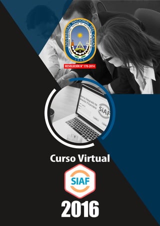 Este documento presenta un curso virtual sobre el Sistema Integrado de Administración Financiera (SIAF) dirigido a funcionarios públicos. El curso explica los diferentes módulos del SIAF relacionados con la planificación, el proceso presupuestario, las operaciones administrativas, de tesorería y contables. Los participantes recibirán una certificación de 100 horas de la Universidad Nacional de Callao al finalizar el curso.