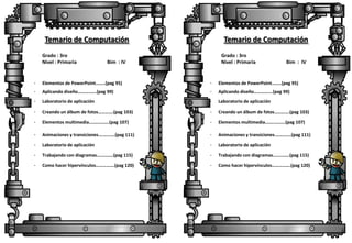 Este documento contiene el temario de computación para diferentes grados de primaria y secundaria. Incluye temas sobre programas como PowerPoint, Publisher, Photoshop, CorelDRAW, entre otros. Para cada grado detalla los temas que se abordarán en el cuarto bimestre con las páginas de referencia en el material de estudio.
