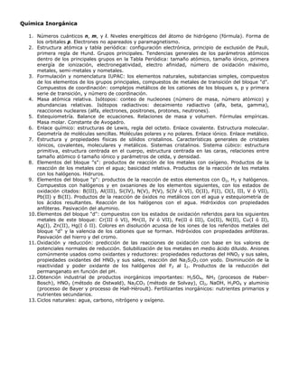 Este documento presenta el temario de la XII Olimpiada Peruana de Química. Incluye los principales tópicos de química analítica, inorgánica, orgánica y física que serán evaluados en la competencia. Los contenidos abarcan desde conceptos básicos como disoluciones y equilibrios químicos, hasta temas más avanzados como espectroscopía, termodinámica y estructura atómica. El objetivo del temario es guiar a los estudiantes en su preparación para la olimp