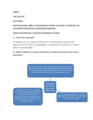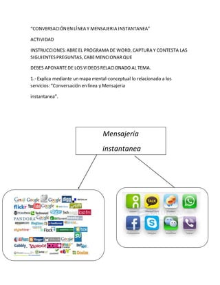 Este documento presenta preguntas sobre varios temas relacionados con las tecnologías de la información y la comunicación como la netiqueta, conversación en línea, modificaciones del lenguaje, grupos y foros de discusión, educación en línea, peer to peer, comercio electrónico, videoconferencia, transmisión, acceso remoto y redes sociales. Los estudiantes deben responder cada pregunta usando mapas conceptuales para explicar los conceptos clave de cada tema.