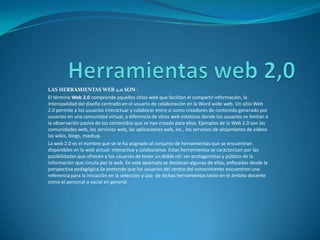 Las herramientas web 2.0 permiten a los usuarios interactuar y colaborar en la creación de contenido en comunidades virtuales. Google Drive y Dropbox son ejemplos de estas herramientas, que permiten el almacenamiento y compartición de archivos en la nube de forma privada y segura. Google Drive ofrece gran capacidad de almacenamiento y la posibilidad de recuperar archivos eliminados, mientras que Dropbox facilita la sincronización y compartición de archivos sin importar la conexión. Ambas herramientas tienen ventajas como la interfaz,