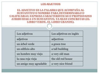 Este documento proporciona una lista de temas gramaticales en inglés como adjetivos, artículos, auxiliares, conectores, preposiciones y verbos. También incluye ejemplos de cómo se usan estos elementos gramaticales y explicaciones breves sobre su significado y uso. Los temas cubiertos incluyen adjetivos, artículos, auxiliares modales, conectores, preposiciones, verbos regulares e irregulares en tiempo pasado y participio, y adverbios de frecuencia.