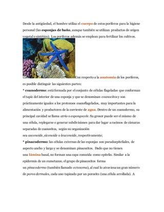 Este documento define y describe los poríferos y los platelmintos. Los poríferos son animales acuáticos sin órganos ni sistema nervioso que se alimentan filtrando el agua a través de poros. Los platelmintos son gusanos planos sin cabeza ni sistema circulatorio que pueden ser parásitos y afectar a humanos transmitiendo enfermedades. Ambos grupos desempeñaron papeles importantes en experimentos tempranos sobre memoria y aprendizaje.