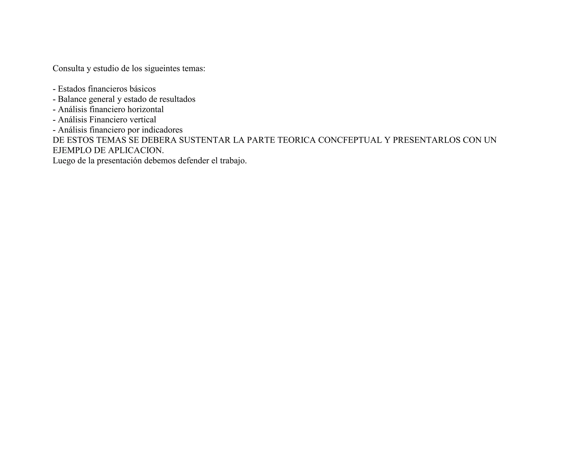 El documento solicita el estudio y consulta de temas relacionados con los estados financieros básicos, análisis financieros horizontales, verticales e indicadores. Se debe presentar la teoría conceptual de cada tema y aplicarlos con un ejemplo, para luego defender el trabajo.