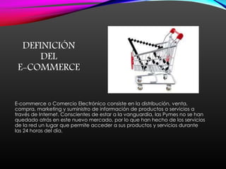 El documento define el e-commerce como la distribución, venta, compra, marketing y suministro de información de productos o servicios a través de Internet. Explica que los antecedentes del e-commerce se remontan a 1920 con la venta por catálogo y que en 1970 surgen las primeras relaciones comerciales usando ordenadores. Finalmente, describe los tres tipos principales de e-commerce: B2B, B2C y C2C.