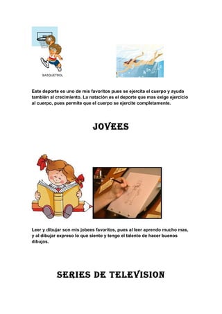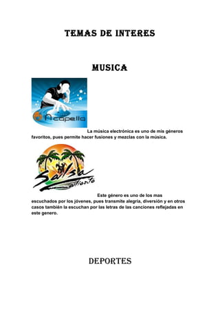 Este documento presenta los intereses del autor en varios temas como música electrónica, deportes como la natación, pasatiempos como leer y dibujar, y series de televisión como Los Simpson y programas de Animal Planet.
