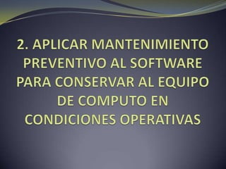 El documento habla sobre la importancia de aplicar mantenimiento preventivo al software y hardware de una computadora para mantenerlos en buenas condiciones operativas. Se mencionan acciones como respaldar la información, desfragmentar las unidades de almacenamiento, corregir errores lógicos, usar utilerías antivirus y otras herramientas de software como firewalls y navegadores. El objetivo es prevenir fallas, proteger los datos y mejorar el rendimiento general del equipo.
