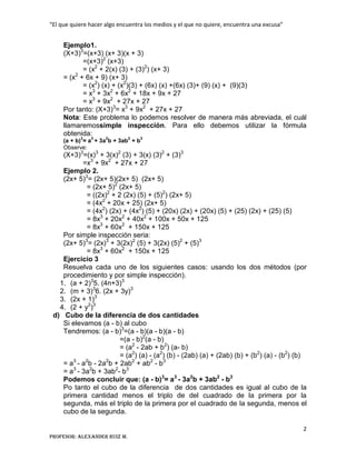 (1) El documento presenta información sobre productos notables y diferentes tipos de factorización, incluyendo cuadrados de la suma y diferencia de cantidades, cubos de la suma y diferencia, y productos de binomios. (2) Define conceptos como productos notables y diferentes casos de factorización como factor común, trinomio cuadrado perfecto, diferencia de cuadrados perfectos. (3) El objetivo es que los estudiantes aprendan a reconocer y aplicar diferentes métodos de factorización para resolver ejercicios algebraicos.