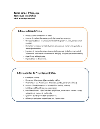 El documento presenta los temas que se cubrirán en el segundo trimestre sobre Tecnología Informática. Se estudiarán procesadores de texto, incluyendo operaciones básicas, formato, inserción de elementos e impresión. También se analizarán herramientas de presentación gráfica, con conceptos sobre el entorno, desarrollo, edición y modificación de presentaciones, así como efectos especiales y formas de impresión.