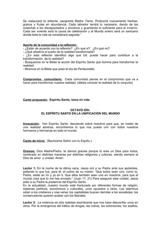 Este documento presenta las reflexiones de varios lectores sobre cómo el Espíritu Santo puede ayudar a transformar la realidad e impulsar la unidad en el mundo. Se discute la necesidad de tener fe en que un cambio positivo es posible, ponerse de acuerdo sobre un sueño común y compartir los recursos de manera equitativa. También se enfatiza la importancia de respetar la naturaleza, reconocer la igualdad de género y promover la paz entre las naciones. Finalmente, se invita a la comunidad a comprometer