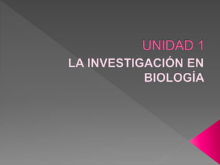 La investigación en biología se basa principalmente en la experimentación para generar conocimiento sobre los seres vivos. Aunque no todas las áreas permiten experimentación debido a limitaciones metodológicas o éticas. La biología estudia la organización molecular, estructural y fisiológica de los seres vivos, así como la biodiversidad y reproducción. En el siglo XX hubo grandes avances como el descubrimiento de las neuronas, la penicilina, que el ADN es el material hereditario y la determinación de la estructura del ADN.