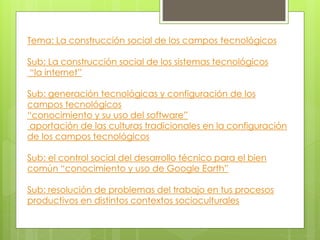 Este documento discute la construcción social de los campos tecnológicos. Explica que la tecnología influye en la cultura al resolver necesidades humanas. También describe cómo las generaciones tecnológicas corresponden a modelos sociales específicos y cómo las innovaciones tecnológicas han configurado las culturas del siglo XX. Además, enfatiza la importancia del control social del desarrollo técnico y de considerar factores como los beneficios, riesgos, factibilidad y eficiencia de sistemas socio-técnicos desde
