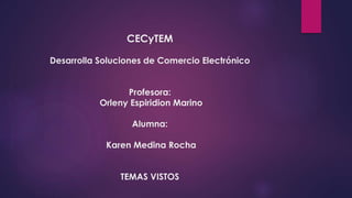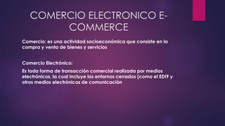El documento describe el comercio electrónico y sus ventajas. El comercio electrónico permite el intercambio de documentos comerciales entre socios a través de Internet, lo que reduce el trabajo administrativo y acelera las transacciones. Existen diferentes tipos de comercio electrónico como el business-to-business, business-to-consumer y consumer-to-consumer. Las plataformas de comercio electrónico facilitan el encuentro entre empresas y consumidores para realizar transacciones en línea.