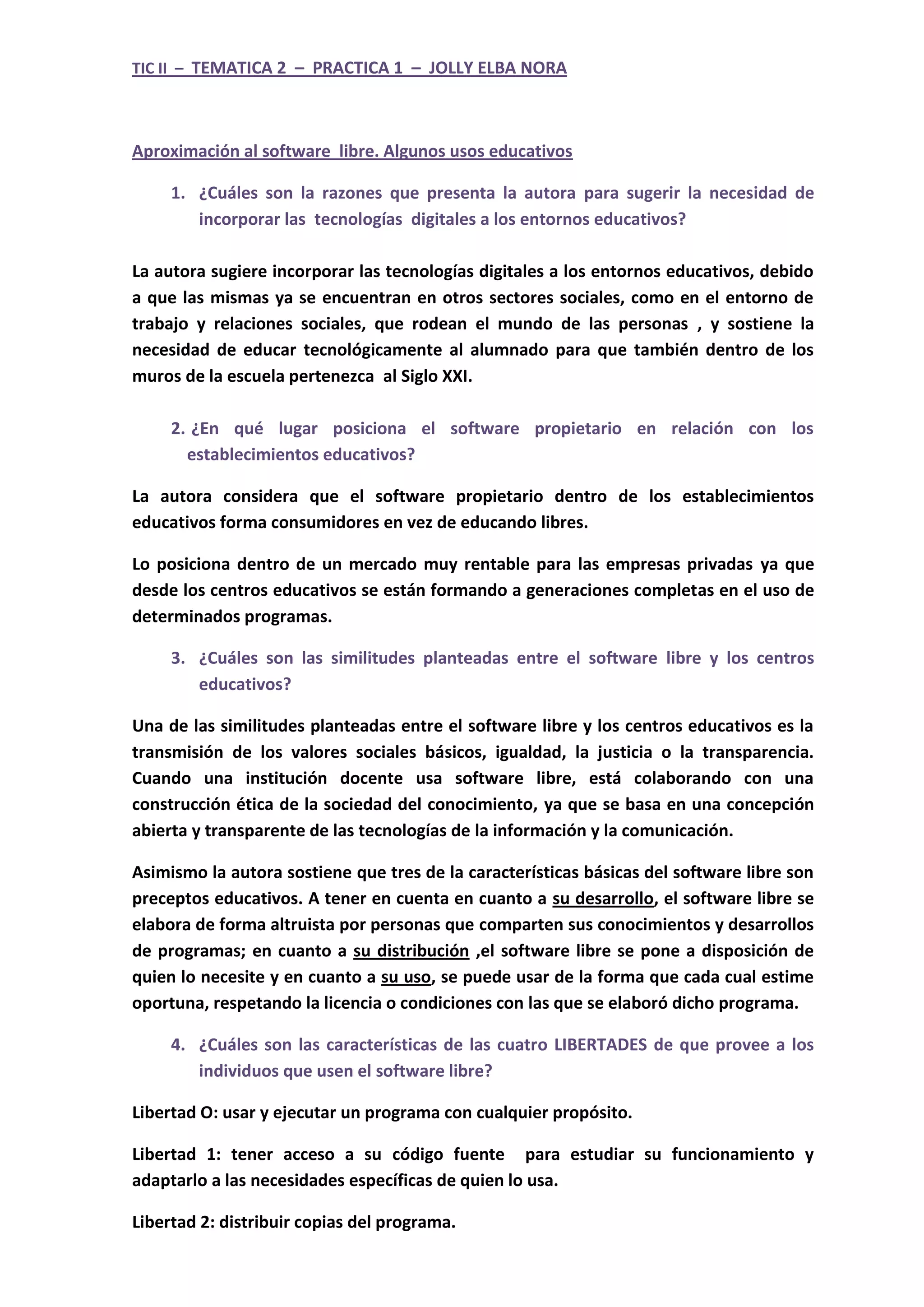 El documento presenta una introducción al software libre y sus usos educativos. Explica que las tecnologías digitales deben incorporarse a los entornos educativos para educar a los estudiantes en el siglo XXI. Posiciona el software propietario como una herramienta que forma consumidores en lugar de ciudadanos libres. Identifica similitudes entre el software libre y los centros educativos como la transmisión de valores como la igualdad y la justicia. Describe las cuatro libertades del software libre y diferentes tipos de licencias como las Creative Commons.