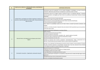 El documento describe los contenidos propuestos para un curso de preparación para la maternidad y paternidad. Los temas incluyen cambios físicos y psicológicos durante el embarazo, reconocimiento de signos de alarma, ejercicios físicos y de relajación para el parto, derechos sexuales y reproductivos, lactancia materna, cuidados del recién nacido, apego seguro, pautas de crianza y estimulación temprana.