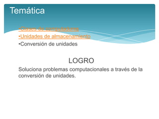 Este documento resume las clases de computadores, unidades de almacenamiento y conversión de unidades. Cubre los macrocomputadores, microcomputadores, minicomputadores y supercomputadores, así como discos duros, discos duros portátiles, CD-ROM, DVD, memoria USB, memoria micro SD y disquetes. Explica las definiciones, ubicaciones, capacidades e historias de cada unidad.