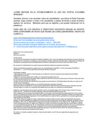 Este documento describe varios temas relacionados con el uso de medios y TIC en la educación. Incluye preguntas sobre las fortalezas de la institución educativa en relación con los medios y TIC, y sobre cómo motivar el uso del portal Colombia Aprende. También describe las actividades de un grupo de directivos docentes para conformar un equipo de gestión de TIC, realizar un diagnóstico y plan de gestión, y comunicar los procesos de gestión a través de plataformas como SlideShare.