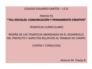 Este documento presenta una serie de temáticas curriculares que serán abordadas en el desarrollo de un proyecto sobre TICs y pensamiento creativo en el Colegio Eduardo Santos. Incluye reseñas de las temáticas como valores culturales y ciudadanos enfocados en museos, monumentos, sitios turísticos, folclor colombiano y más. También cubre tecnología doméstica, economía colombiana, impactos de la globalización, medios de comunicación, derechos fundamentales y vulnerables, valores humanos e