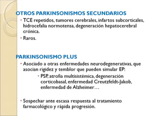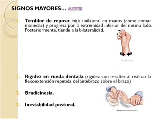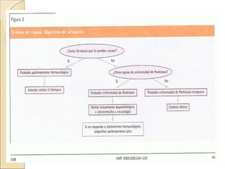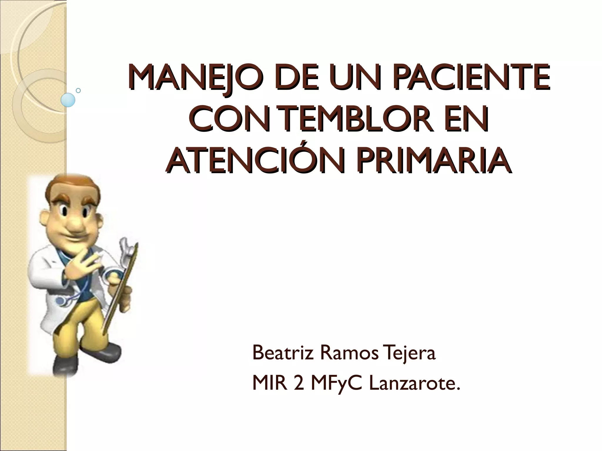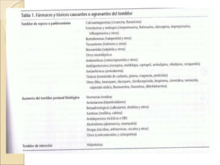 Este documento proporciona una guía sobre el manejo de pacientes con temblor en atención primaria. Describe los diferentes tipos de temblor, incluyendo temblor de reposo, temblor esencial, temblor cerebeloso y parkinsonismo farmacológico. Explica cómo realizar un examen dirigido y ofrece recomendaciones sobre el tratamiento de condiciones como el temblor esencial, la enfermedad de Parkinson y el parkinsonismo inducido por fármacos. También indica cuándo derivar a un