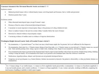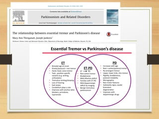 El temblor esencial es el tipo de temblor patológico más común, con una prevalencia que aumenta con la edad y presenta una heterogeneidad tanto clínica como patológica. Se relaciona con una mayor incidencia de demencia y síntomas psiquiátricos, y su tratamiento muestra variabilidad en la respuesta. La coexistencia con la enfermedad de Parkinson genera un perfil clínico distinto, afectando la cognición y la calidad de vida de los pacientes.