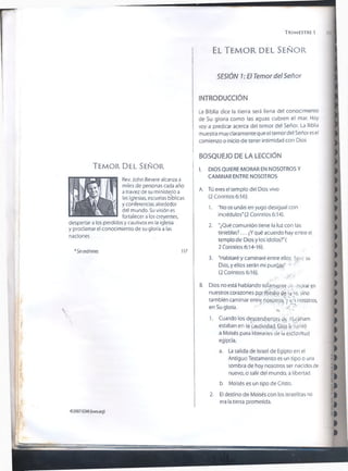 El documento habla sobre el temor del Señor. Explica que el temor del Señor es el comienzo de tener intimidad con Dios. También discute cómo Dios quiere morar en nosotros y caminar entre nosotros, pero para hacerlo, debemos consagrarnos y limpiarnos de pecado. Finalmente, dice que a través del temor del Señor podemos conocer a Dios íntimamente.