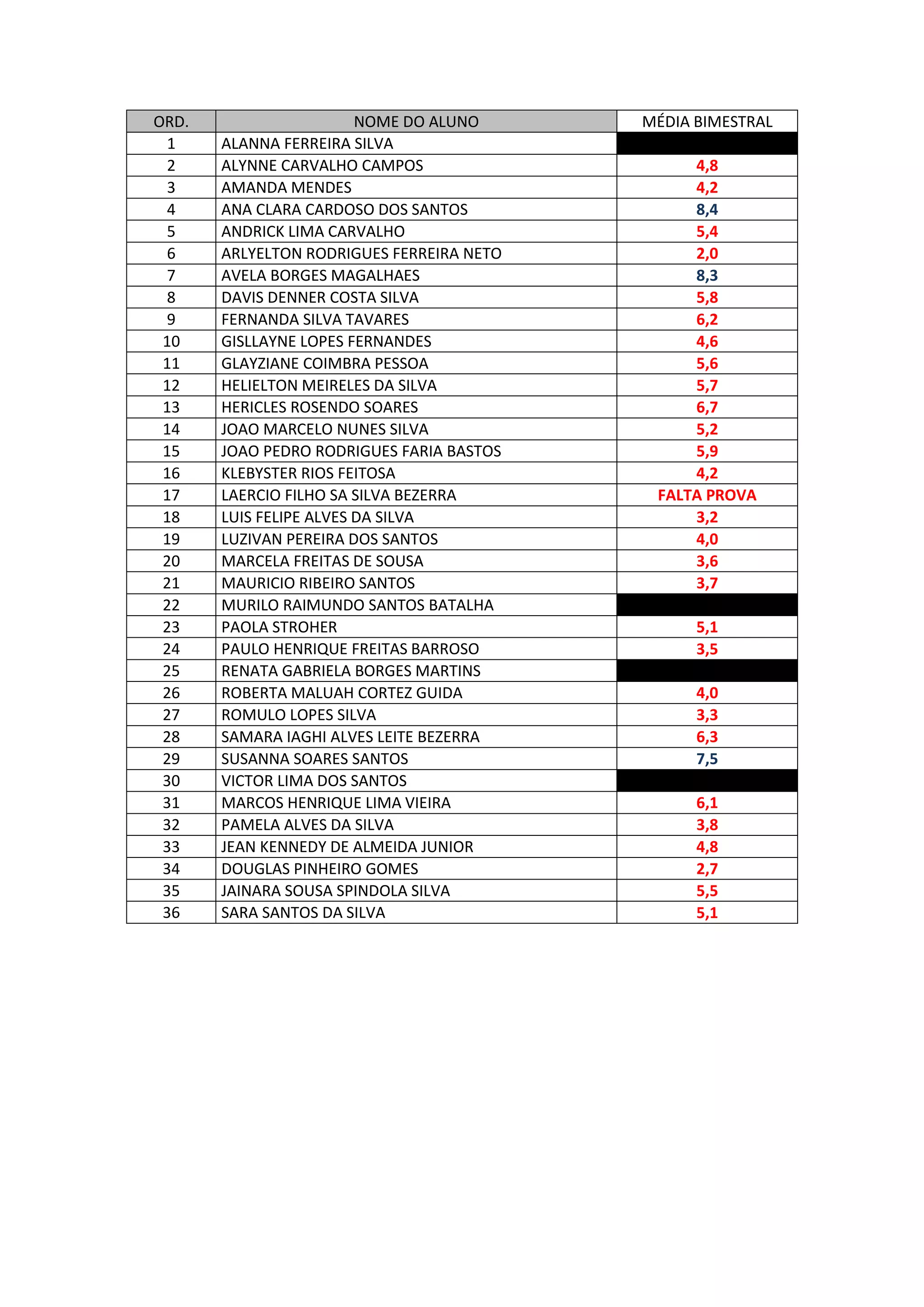 Este documento contiene una lista de 36 estudiantes con sus respectivos números de orden y calificaciones promedio bimestrales. La calificación promedio más alta es 8,4 y la más baja es 2,0. Algunos estudiantes no tienen una calificación promedio registrada o faltaron al examen.