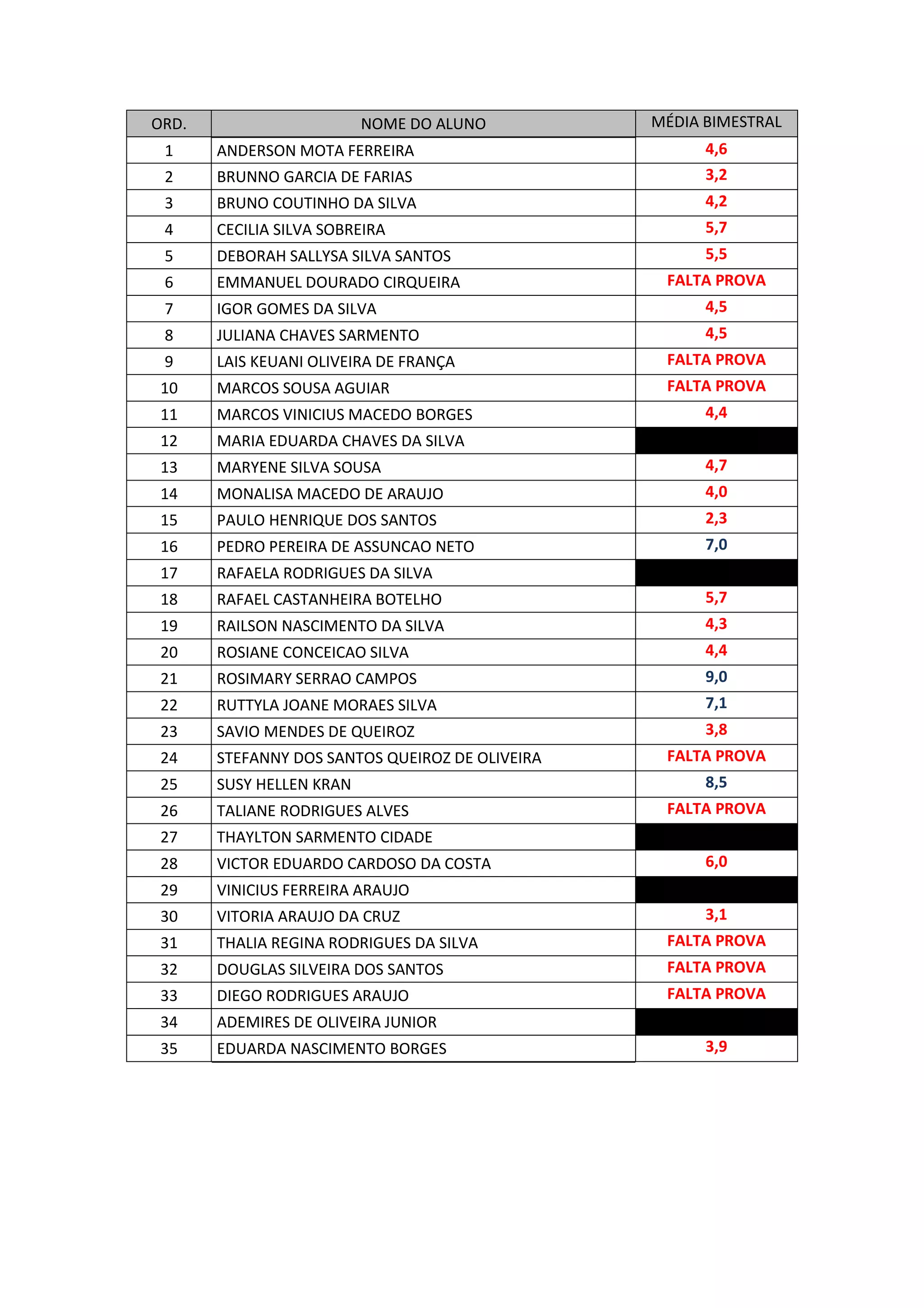 Este documento lista los nombres de 35 estudiantes y sus respectivas calificaciones promedio en el bimestre. La mayoría de los estudiantes tienen calificaciones entre 2,3 y 7,1, aunque algunos faltaron al examen. El estudiante con la calificación más alta fue Rosimary Serrao Campos con 9,0 y el más bajo fue Paulo Henrique dos Santos con 2,3.