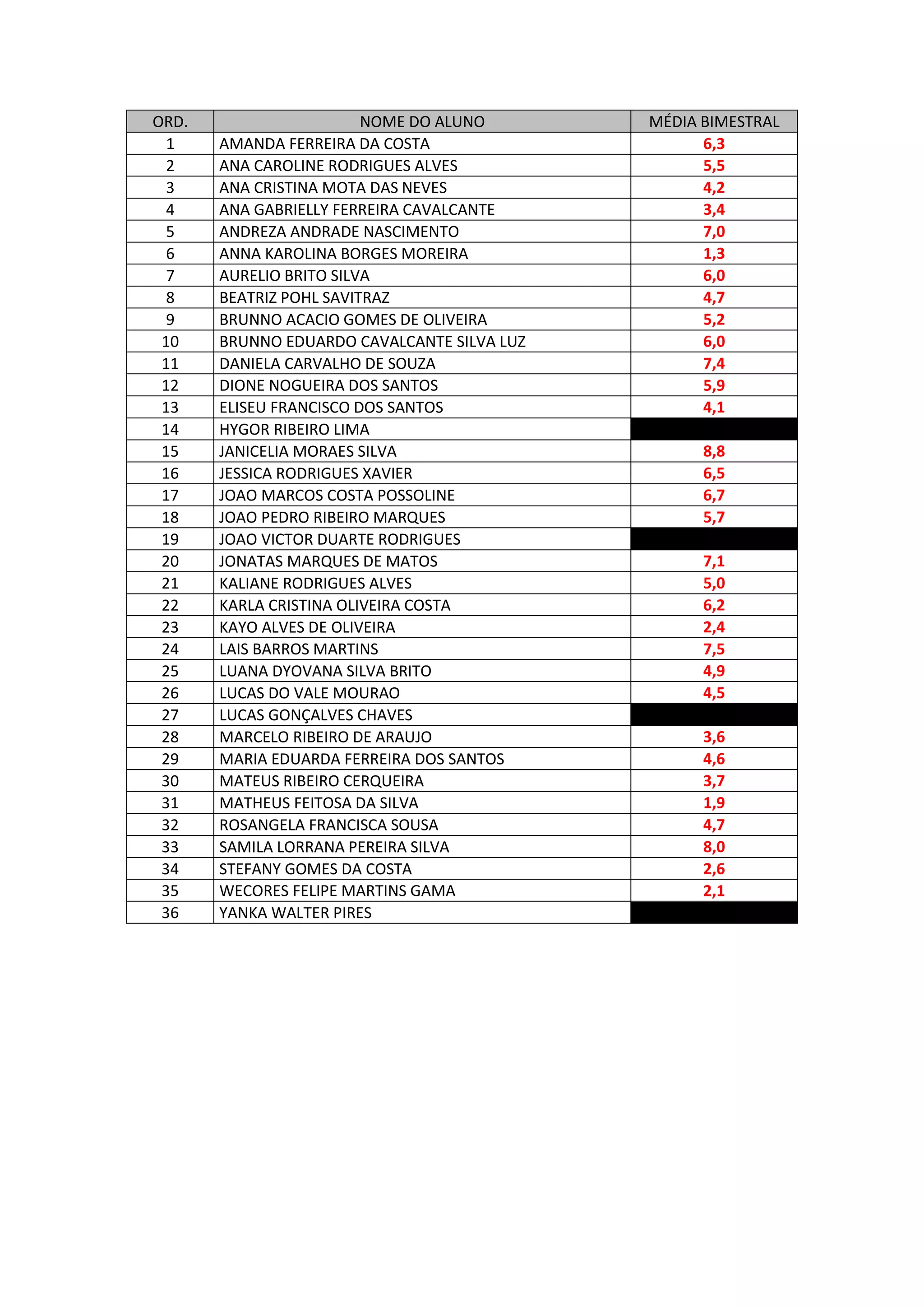 Este documento lista 36 estudiantes con sus respectivos números de orden y promedios bimestrales. Los promedios varían de 1,3 a 8,8. La estudiante con el promedio más alto es Janicelia Moraes Silva con 8,8 y la más baja es Anna Karolina Borges Moreira con 1,3.