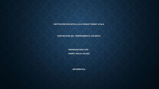 El documento describe las características del temperamento colérico. Las personas coléricas tienden a ser líderes enérgicos y decididos que se enfocan en lograr sus metas de manera independiente y productiva. Sin embargo, también pueden ser dominantes, inflexibles e insensibles a los sentimientos de los demás. Para tener éxito en las relaciones, los coléricos deben aprender a escuchar otras perspectivas y ser más afectuosos.