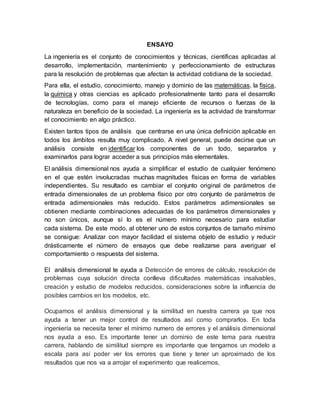 La ingeniería aplica conocimientos científicos como las matemáticas y la física para desarrollar estructuras y resolver problemas que afectan a la sociedad. Existen diversos tipos de análisis, como el análisis dimensional, que ayuda a simplificar el estudio de fenómenos físicos al cambiar parámetros dimensionales por adimensionales. El análisis dimensional reduce errores y la necesidad de ensayos, y es una herramienta útil en ingeniería.