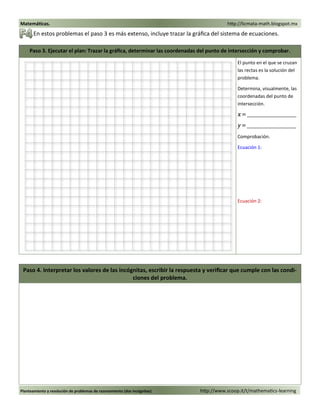 El documento describe un método para plantear y resolver problemas de razonamiento que involucran dos incógnitas mediante un proceso de cuatro pasos: entender el problema, configurar el plan, ejecutar el plan e interpretar los resultados. Cada paso implica un enfoque algebraico para establecer ecuaciones y graficar el sistema para encontrar la solución. El enfoque incluye verificar que la solución cumpla con las condiciones del problema original.
