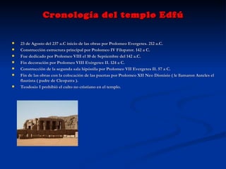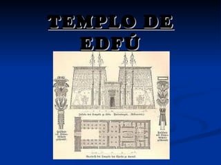 El Templo de Edfú en Egipto fue construido entre los años 237 a.C. y 57 a.C. por varios gobernantes de la dinastía Ptolemaica. El templo sigue el estilo arquitectónico egipcio clásico pero con mayor armonía y equilibrio debido a las influencias helénicas. Es el templo mejor conservado de Egipto, con características como un gran pilono, patios, dos salas hipóstilas y salas dedicadas a diferentes dioses.