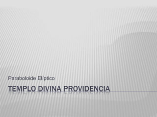 El documento describe las características geométricas de un paraboloide elíptico y cómo se aplica esta forma en la cúpula del Templo Divina Providencia en México, también conocido como el Templo del Huevo. Un paraboloide elíptico es una superficie de revolución generada al girar una parábola alrededor de su eje; la cúpula sigue esta forma. Aunque el templo presenta una estructura geométrica interesante, lamentablemente se encuentra en un estado de deterioro.