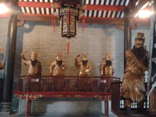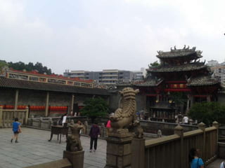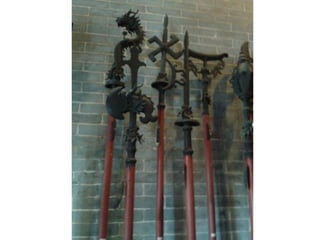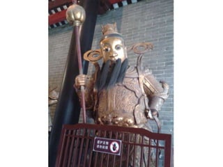 El documento describe las diferentes salas y exhibiciones del Templo de los Ancestros de Foshan, incluyendo muñecos, escritos, trajes y armas relacionadas con figuras históricas importantes de las artes marciales chinas como Ip Man, Bruce Lee, Wong Fei Hung y Jet Li. También muestra esculturas y estatuas de dioses y figuras religiosas como el Dios del Norte y Confucio.