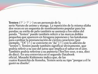 Tenten es un miembro femenino del Equipo Gai en Naruto. Es experta en el uso de armas que mantiene selladas en pergaminos. Su meta es volverse tan fuerte como la legendaria Tsunade. Participa en misiones y exámenes Chunin junto a su equipo, demostrando gran habilidad con las armas a pesar de perder contra Temari en los preliminares.