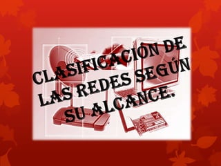 Este documento clasifica las redes según su alcance en: red de área personal, red inalámbrica de área personal, red de área local, red de área local inalámbrica, red de área de campus y red de área metropolitana. Define cada una y explica que las primeras son para uso personal cercano al punto de acceso, mientras que las otras cubren áreas más grandes como un edificio, campus o ciudad.