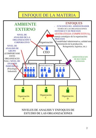 El documento describe el proceso de administración estratégica de una organización, incluyendo el análisis externo e interno, la formulación de la estrategia a diferentes niveles, la implementación y evaluación del plan estratégico. Explica los enfoques de ajuste e intento estratégico y presenta un modelo general del proceso de administración estratégica.