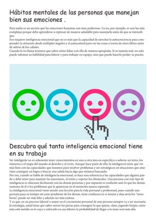 El documento describe las características de las personas con alta inteligencia emocional. Estas personas tienen un amplio vocabulario emocional que les permite comprender y expresar sus emociones con precisión. También sienten curiosidad por los demás debido a su empatía. Además, son capaces de superar sus errores aprendiendo de ellos sin dejar que les afecten negativamente. La inteligencia emocional es importante para el éxito personal y profesional ya que permite manejar las emociones como la ira de manera adecuada y trabajar