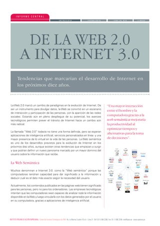Este documento presenta varias tendencias tecnológicas que podrían definir el desarrollo de Internet en los próximos 10 años, incluyendo: (1) El surgimiento de la "Web 3.0" o "Web semántica" que permitirá a las computadoras comprender y procesar mejor la información; (2) Una Internet más personalizada que recomiende contenido basado en los intereses y hábitos del usuario; (3) Nuevas interfaces como el "e-touch", "e-talk" y "e-think" que permitan controlar disposit