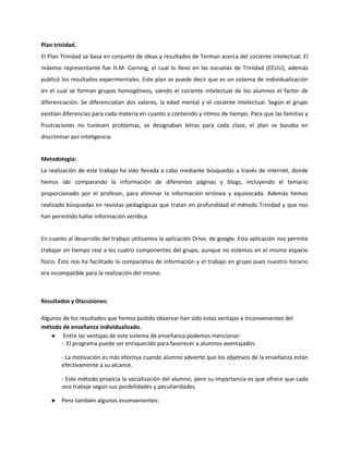 El documento resume el método de enseñanza individualizada conocido como Plan Trinidad. El Plan Trinidad clasifica a los estudiantes en grupos homogéneos basados en su cociente intelectual y edad mental para personalizar el contenido y ritmo de aprendizaje. El documento también discute las ventajas e inconvenientes del método de enseñanza individualizada y concluye que este método guarda relación con los principios de la Escuela Nueva de centrarse en los intereses y aptitudes individuales del estudiante.